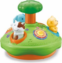 | Bączek stymuluje wszystkie zmysły dziecka oraz wspiera jego rozwój. Błyszczące, żywe kolory, przyjemne dźwięki, jak również migające światełka zachęcają dziecko do zabawy. Bączek ma stabilna podstawkę i wirującą "łąkę" z drzewem i zwierzątkami. Kręci się długo po naciśnięciu korony drzewa. Mówi po polsku, zachęcając do zabawy. Ma 3 funkcyjne przyciski i 3 zwierzątka, których poruszenie wywołuje reakcję zabawki: wydają odgłosy, migają światełka i grają melodyjki. Zabawka ma 2 poziomy głośności. | ![]() |