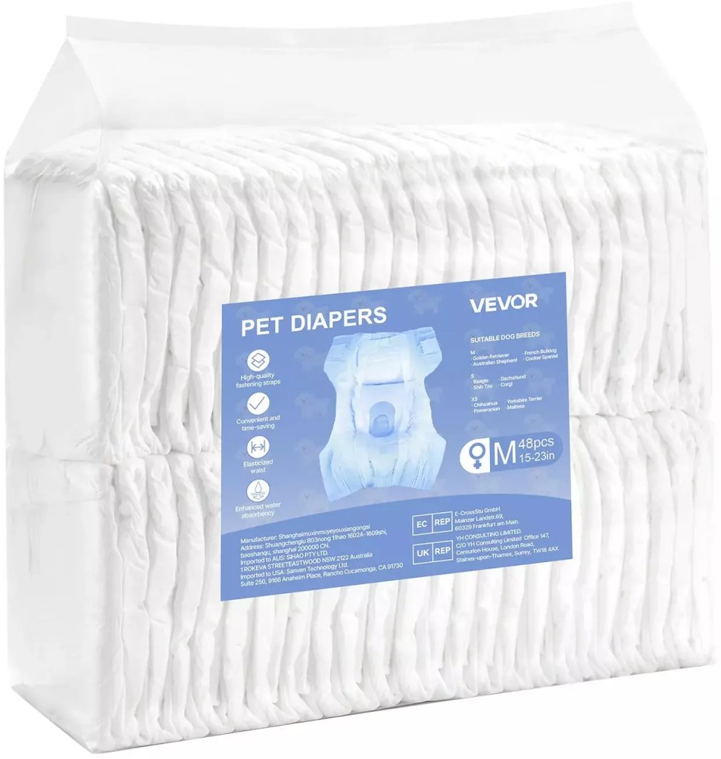 Są to jednorazowe pieluchy w rozmiarze M, przeznaczone dla psów płci żeńskiej o obwodzie talii od 38,1 do 58,4 cm. Wymiary jednej sztuki produktu wynoszą 540 x 350 mm. Łączna ilość w zestawie to 144 sztuki (zapakowane w 2 opakowania po 72 sztuki). Wymiary opakowania wynoszą 380 x 270 x 445 mm, a masa brutto to 4,85 kg.