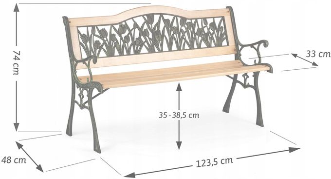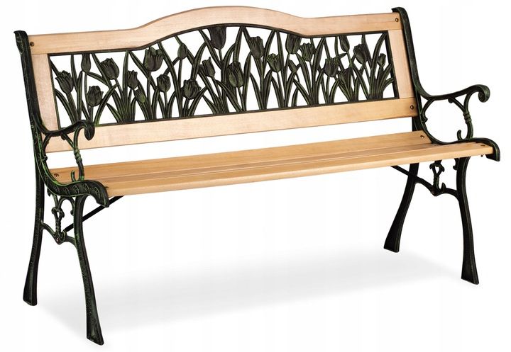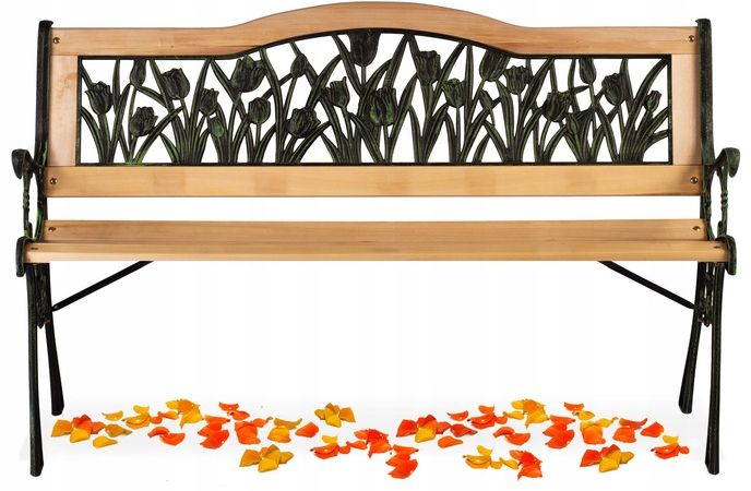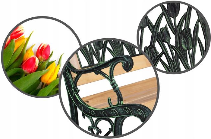 Stylowa ławeczka, która świetnie sprawdzi się w twoim ogrodzie, tarasie lub na patio. Elegancki design przyciąga oko, a roślinne dekory – wiosenne tulipany – dodają jej niepowtarzalnego charakteru. Wygodne siedzisko zapewnia komfort wypoczynku na świeżym powietrzu.