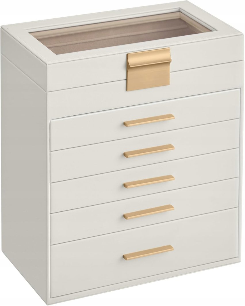 Organizer został stworzony z myślą o funkcjonalności. Posiada 5 szuflad, które umożliwiają wygodne przechowywanie biżuterii, a także dodatkowe miejsce na okulary przeciwsłoneczne. Dzięki temu, możesz mieć wszystkie swoje ulubione akcesoria w jednym miejscu, co pozwala na szybki dostęp do nich w każdej chwili.