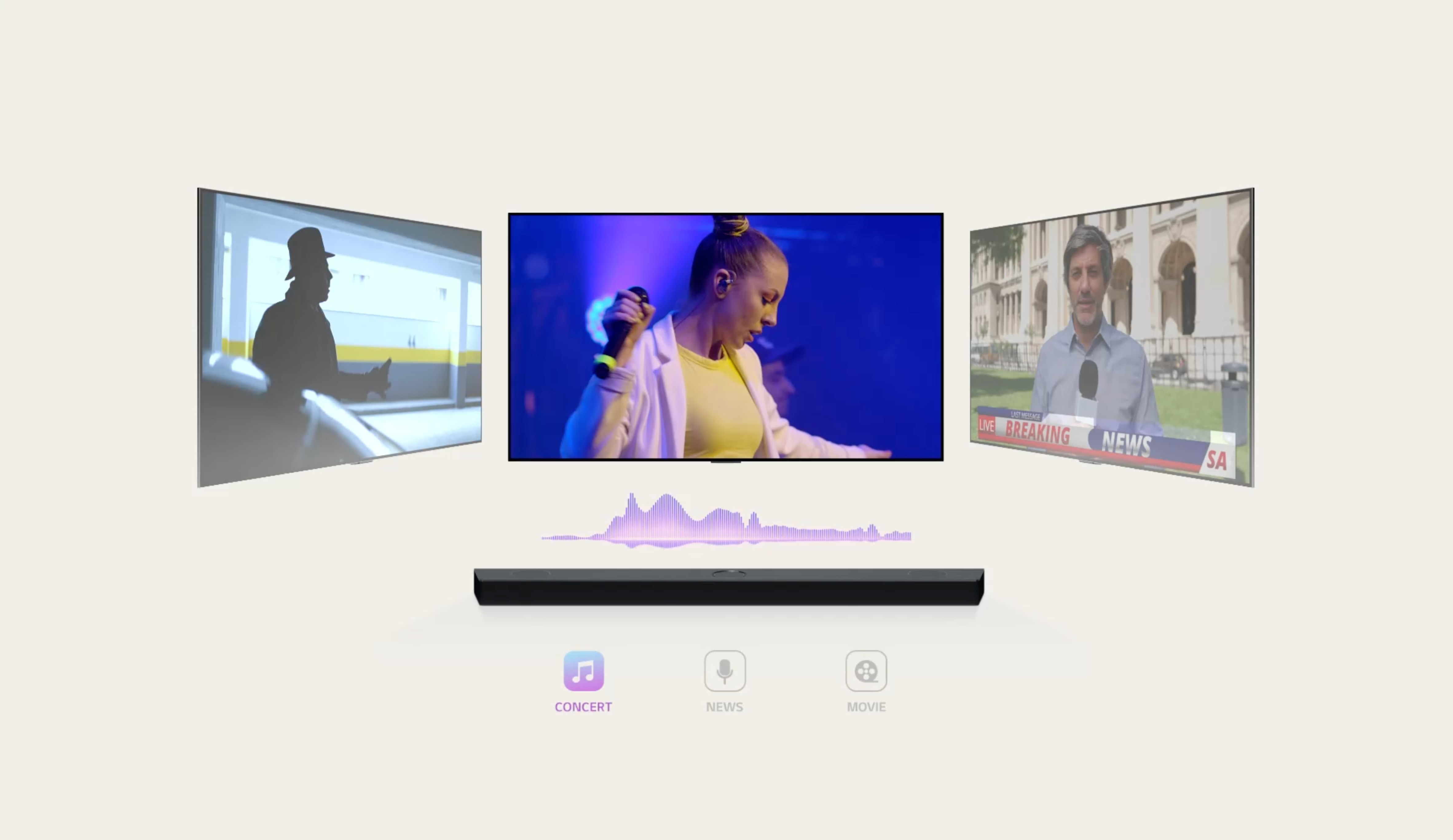Każde pomieszczenie ma inną akustykę, dlatego LG S80TR wyposażono w zaawansowaną funkcję AI Room Calibration Pro. Za pomocą wbudowanych mikrofonów i algorytmów sztucznej inteligencji, system analizuje przestrzeń, w której się znajduje, i automatycznie koryguje zniekształenia dźwięku wywołane przez meble czy ściany. Funkcja ta optymalizuje również współpracę z głośnikami tylnymi, zapewniając idealny balans tonalny i precyzyjne opóźnienia, dzięki czemu dźwięk jest zawsze idealnie dopasowany do Twojego salonu.