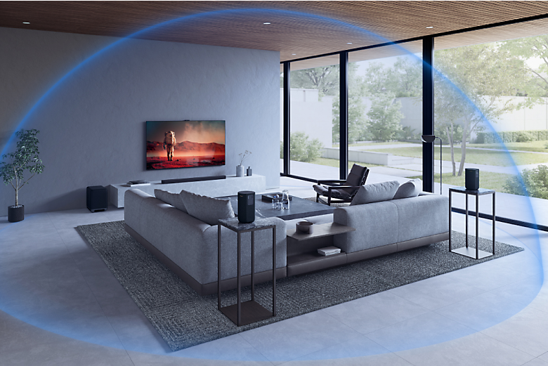 Soundbar HT-A9000 został zaprojektowany, aby współpracować w perfekcyjnej harmonii z kompatybilnymi telewizorami Sony BRAVIA. Technologia Acoustic Center Sync (Synchronizacja Centralnego Głośnika) umożliwia wykorzystanie głośników telewizora jako dodatkowego głośnika centralnego w systemie soundbara. To sprawia, że dźwięk dialogów wydaje się dochodzić bezpośrednio z ekranu, co radykalnie zwiększa immersję i sprawia, że wrażenia audiowizualne stają się niezwykle spójne.
