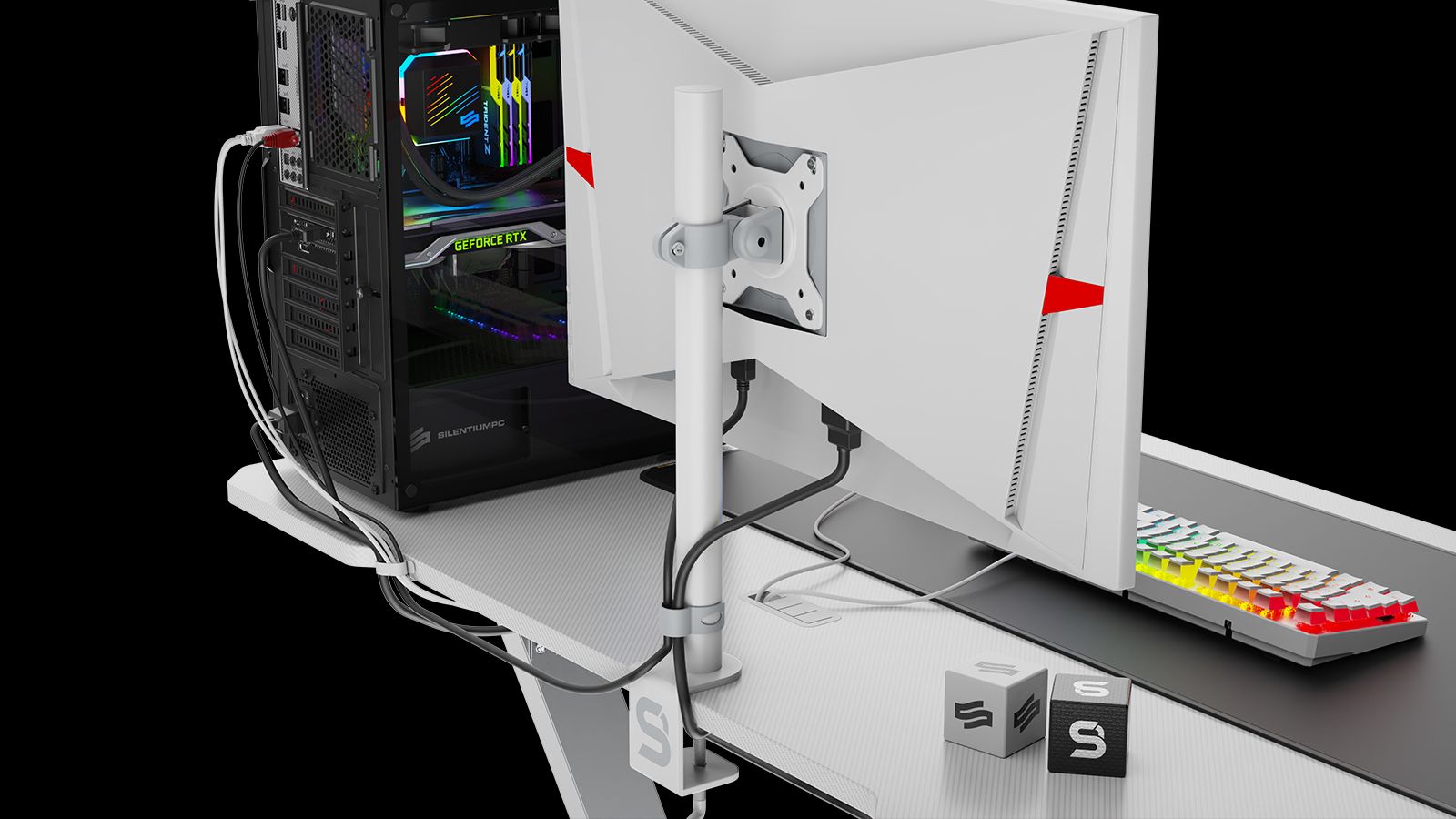 Wybierając akcesoria i peryferia pasujące do jasnej kolorystyki stanowiska komputerowego nie można zapomnieć o najdrobniejszych detalach. Z tego powodu powstał uchwyt na monitor SPC Gear Atlas 100 Onyx White, nawiązujący wyglądem do białej odmiany onyksu — niezwykle wytrzymałego oraz rzadkiego minerału o nietuzinkowej estetyce. Ramię pozwala na zamontowanie szerokiej gamy monitorów i zwiększenie wolnej przestrzeni na biurku, a jednocześnie schludnie prezentuje się wśród innych, białych elementów stanowiska.
