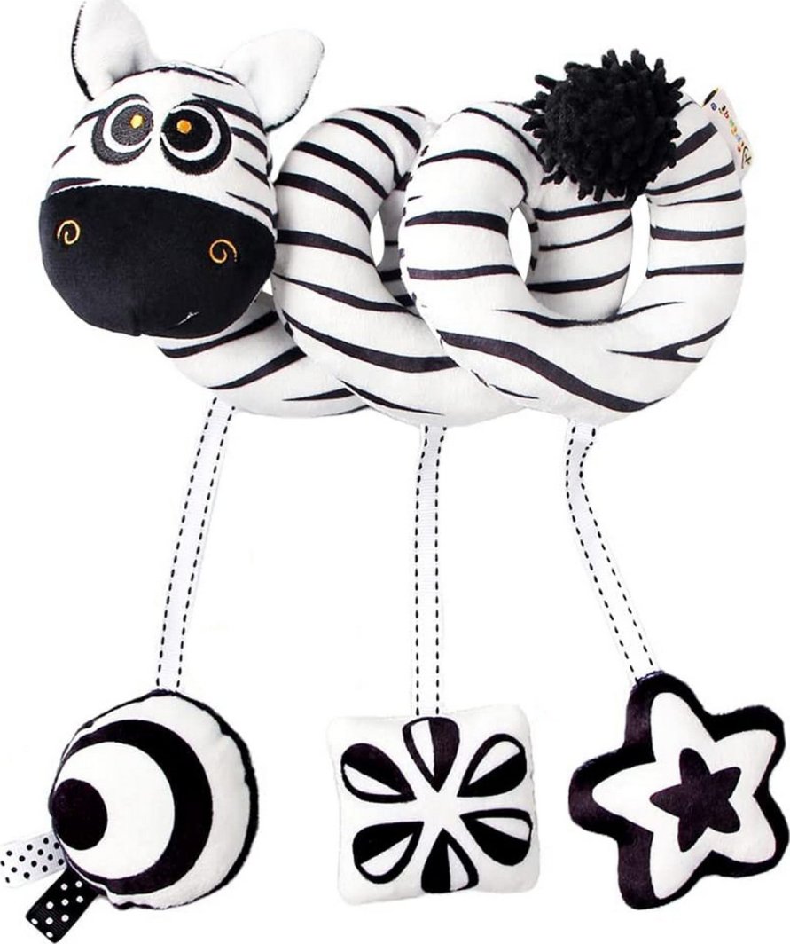 Bawełniana sprężynka pełna zawieszek i grzechotek stanie się najlepszą zabawką dziecka przyciągając jego uwagę oraz pierwsze spotkanie z sensoryczną zabawą i biało-czarną kolorystyczną.