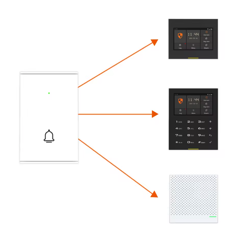 Współpracuje z systemami alarmowymi dostępnymi w naszej ofercie m.in. H700, H501 oraz innymi alarmami GSM i Wi-Fi pracującymi na częstotliwości 433 mHz. W celu alarmowania dzwonek musi być sparowany z systemem alarmowym bezprzewodowo poprzez częstotliwość 433mHz.