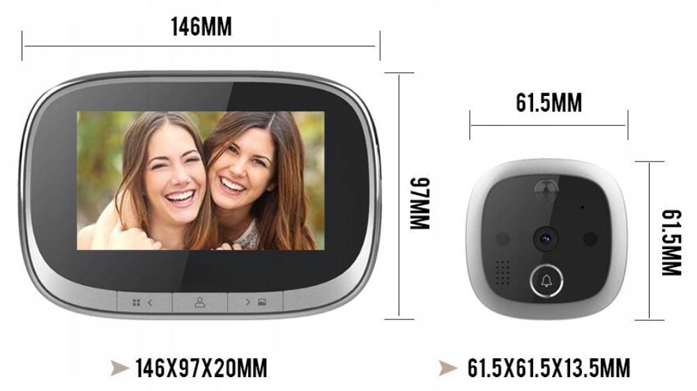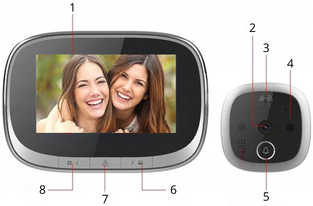 1. Duży kolorowy wyświetlacz LCD 4,3 cala – zapewnia czytelny obraz na żywo oraz możliwość przeglądania zapisanych zdjęć i nagrań, co ułatwia identyfikację osób przed drzwiami.