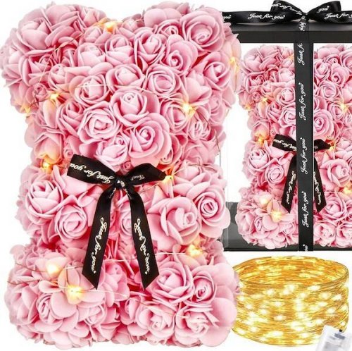 Springos Miś z płatków róż różowy 25 cm miś z róż z lampkami LED biały ciepły UNIWERSALNY