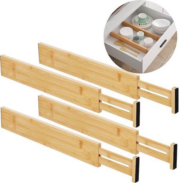Zestaw 4 przegródek marki Springos to idealne akcesorium do lepszej organizacji przestrzeni w szufladach. Separatory wykonane z ekologicznego bambusa w jasnobrązowym kolorze, nie tylko pomogą w uporządkowaniu przestrzeni, ale również dodadzą jej naturalnego uroku. Zestaw składa się z 4 sztuk, które dzięki swojej regulowanej szerokości, od 44,5 cm do 56,5 cm, idealnie dopasują się do różnych rozmiarów szuflad.