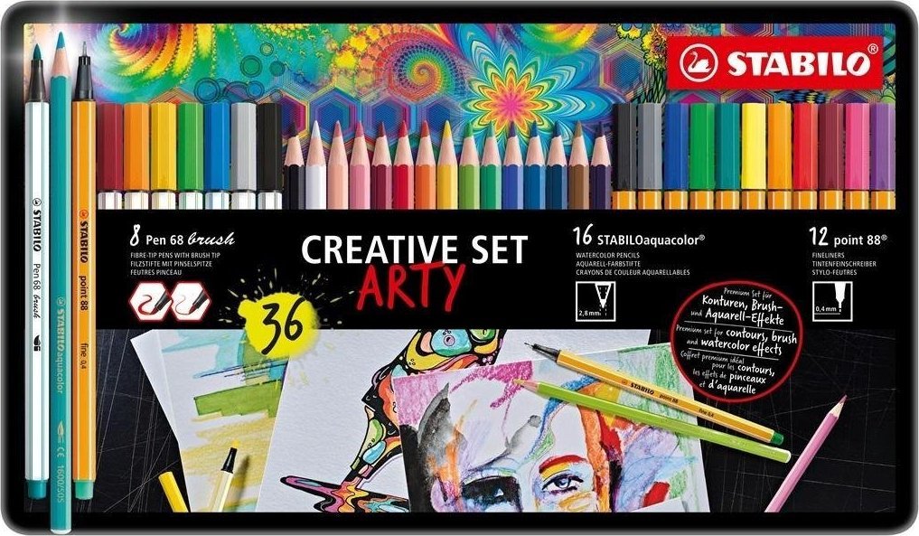 Ten 36 częściowy zestaw kreatywny zawiera: 12 kolorów cienkopisów Point 88, 16 kolorów kredek Aquacolor i 8 kolorów pisaków z pędzelkiem Pen 68.
