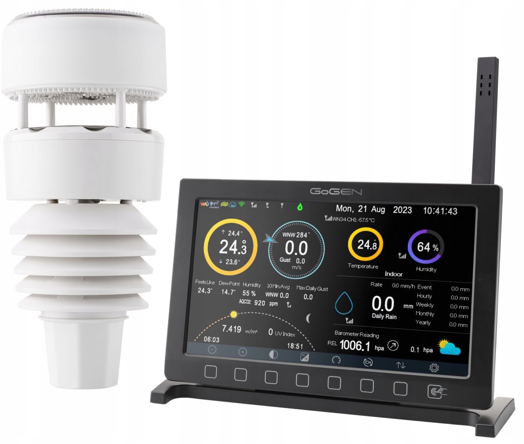 Centralna jednostka stacji wyróżnia się kolorowym ekranem TFT o przekątnej 7 cali, który umożliwia łatwe odczytywanie prognoz pogody oraz innych istotnych danych. Eleganckie czarne wykończenie i kompaktowe wymiary sprawiają, że stacja doskonale wpasowuje się w różne aranżacje wnętrz.