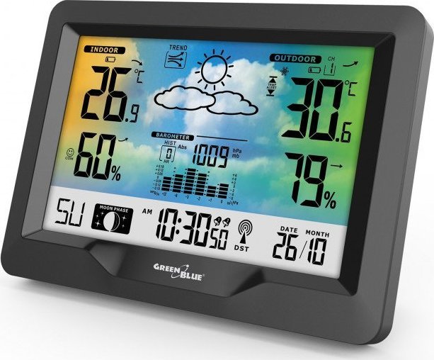Stacja pogodowa GreenBlue Stacja pogodowa bezprzewodowa kolorowa z systemem DCF GreenBlue GB540, fazy księżyca, barometr, kalendarz