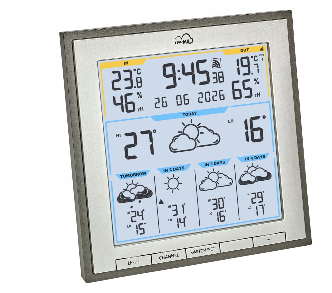 Stacja pogodowa TFA.me ID-08 charakteryzuje się szczegółową wizualizacją warunków atmosferycznych, oferując aż 40 różnych symboli pogodowych. Dzięki temu łatwo zrozumiesz, co czeka Cię w najbliższych dniach.