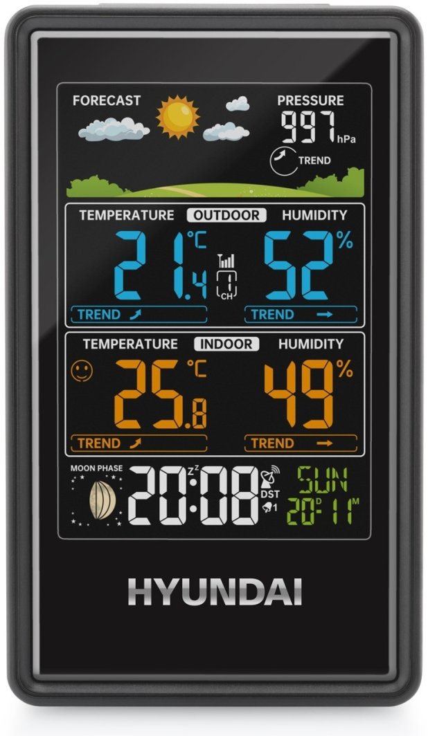 Stacja pogody Hyundai WS2350 to nowoczesne urządzenie, które dostarcza wszelkich niezbędnych informacji o warunkach atmosferycznych. Dzięki eleganckiemu czarnemu designowi oraz kompaktowym wymiarom 86 × 145 mm, doskonale wpasuje się w każde wnętrze. Umożliwia pomiar temperatury, wilgotności oraz ciśnienia barometrycznego, co czyni ją idealnym narzędziem do monitorowania pogody w Twoim domu lub ogrodzie.