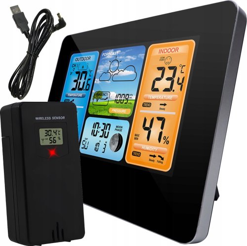 Stacja pogody jest wyposażona w kolorowy wyświetlacz LCD, który ułatwia odczyt danych pogodowych. Nowoczesny design sprawia, że urządzenie doskonale wpasowuje się w każde wnętrze, a możliwość zawieszenia na ścianie pozwala zaoszczędzić cenną przestrzeń.