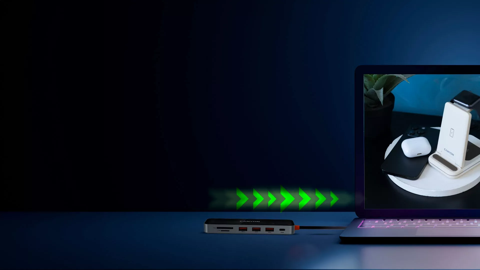 Ten hub USB Canyon obsługuje prędkości transferu danych do 5 Gbps. Wszystkie największe pliki mogą być dostępne bez opóźnień lub przenoszone niesamowicie szybko.