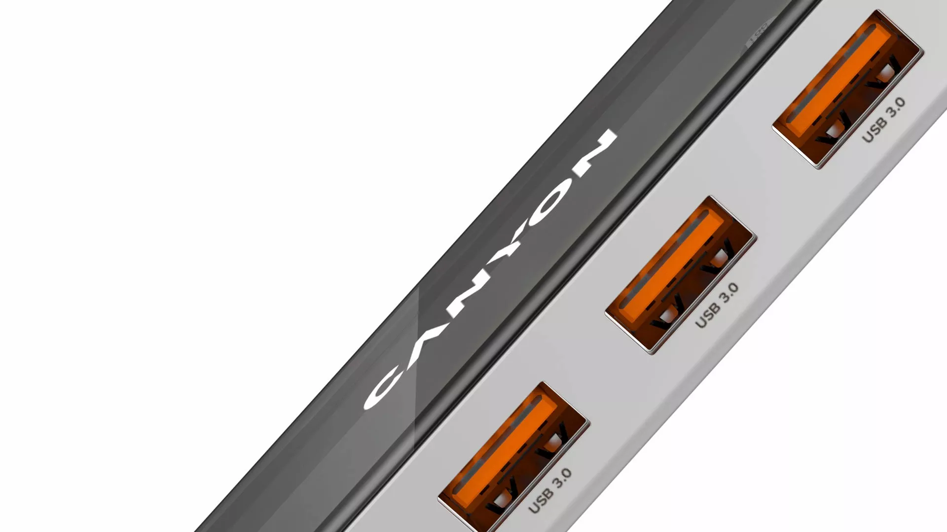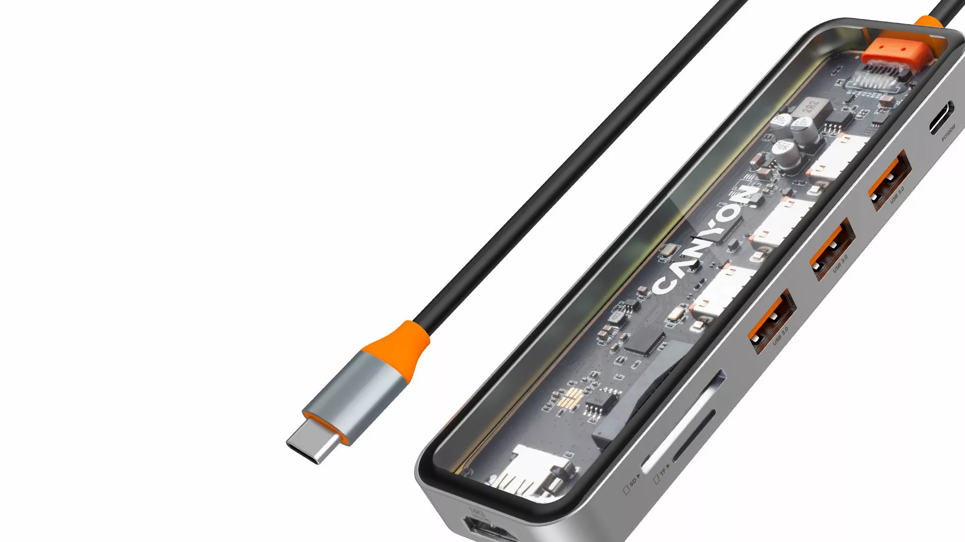 Wykonany ze stopu cynku i hartowanego szkła, ten hub ma lekką, przezroczystą obudowę z ramką w kolorze szarym. Wygląda i sprawia wrażenie premium, oferując wiele funkcji — to właśnie tworzy Canyon.