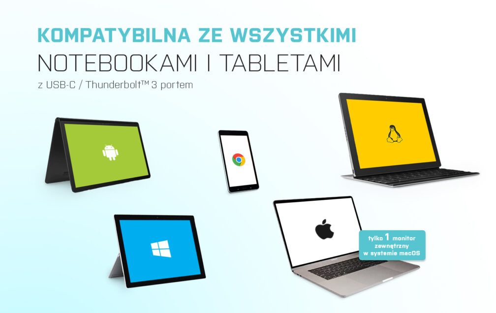 Ta stacja dokująca jest przeznaczona do użytkowania z dowolnym notebookiem, tabletem lub smartfonem, bez względu na typ, markę lub system operacyjny. Wystarczy w notebooku, tablecie czy smartfonie wolny port Thunderbolt 3 lub port USB-C, który umożliwia transmisję sygnału wideo.