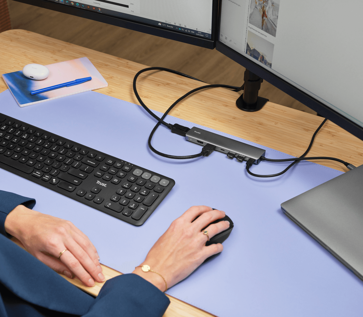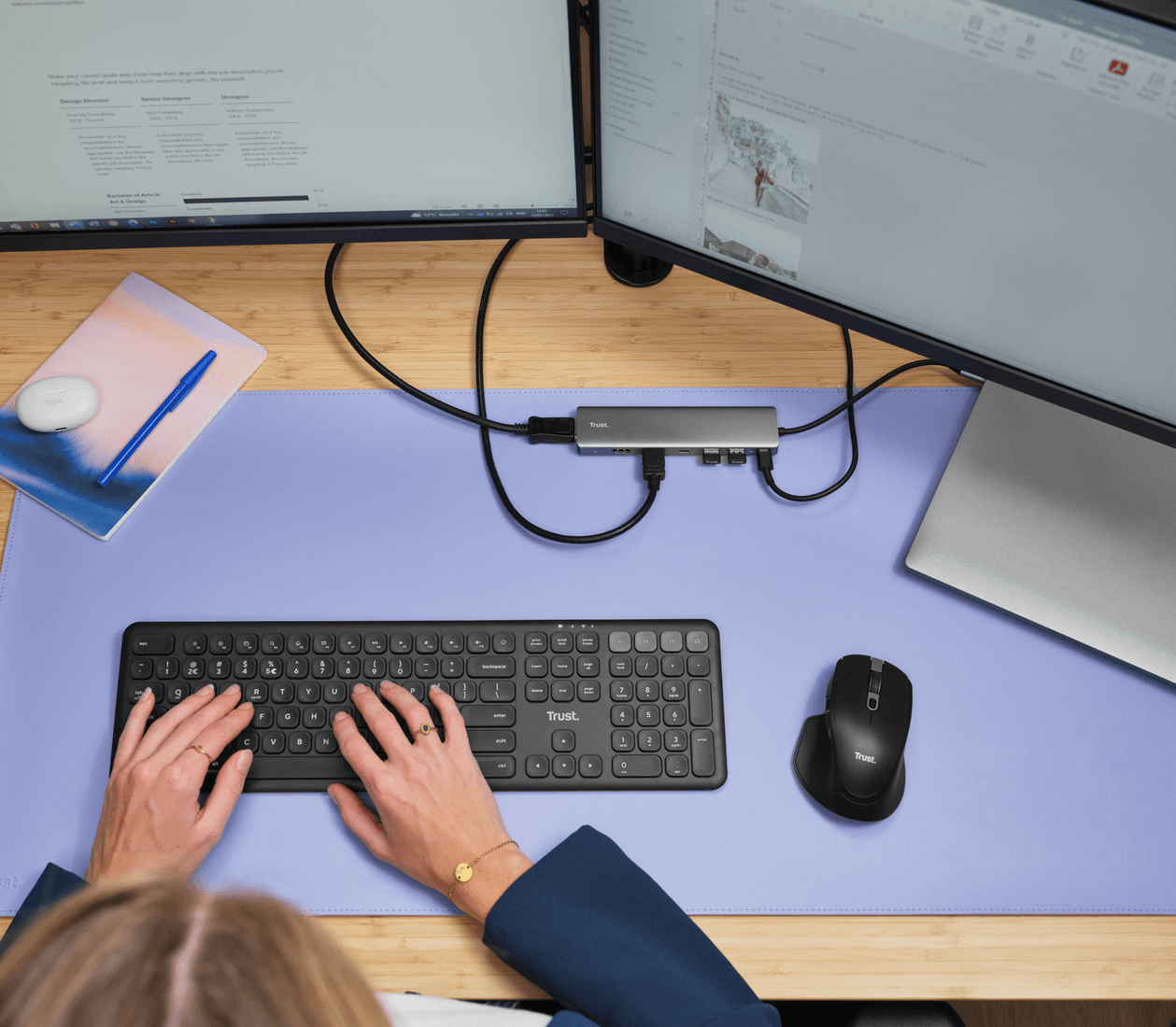 Trust Dalyx 7w1 to zaawansowana stacja dokująca, która przekształca pojedynczy port USB-C w laptopie w siedem funkcjonalnych złączy. Urządzenie zostało zaprojektowane z myślą o użytkownikach wymagających szerokiej przestrzeni roboczej oraz stabilnego połączenia z wieloma akcesoriami jednocześnie. Solidna, aluminiowa obudowa w kolorze szarym zapewnia trwałość i estetyczny wygląd, który dobrze komponuje się z profesjonalnym sprzętem biurowym. Dzięki kompaktowym wymiarom i zintegrowanemu przewodowi o długości 16 cm, adapter jest łatwy w transporcie i nie zajmuje dużo miejsca na biurku.