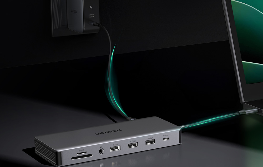 Ugreen Revodok Pro 313 nie tylko rozszerza funkcjonalność Twojego urządzenia, ale także zapewnia jego błyskawiczne ładowanie. Dedykowany port USB-C obsługuje technologię Power Delivery z mocą do 100 W. Pozwala to w mgnieniu oka przywrócić pełną energię w podłączonym laptopie lub tablecie, nawet podczas jednoczesnego korzystania ze wszystkich pozostałych portów.