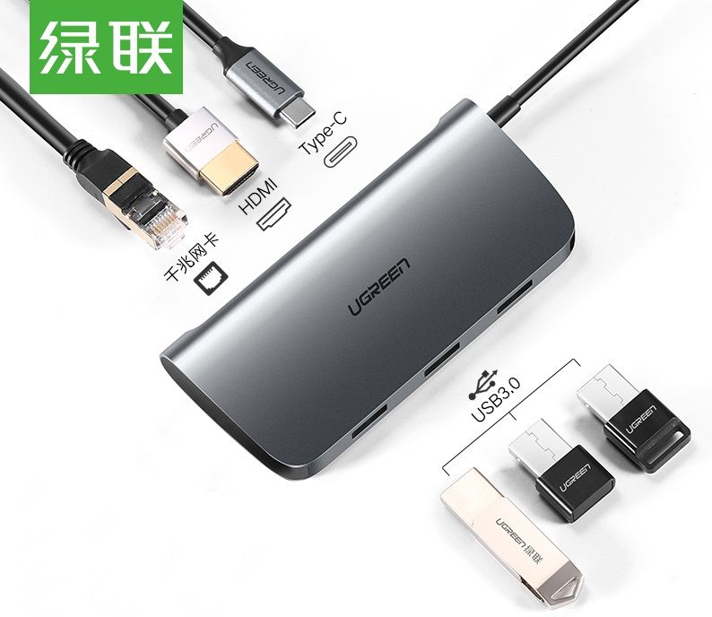 Adapter USB-C firmy UGREEN pozwala na podłączenie wielu urządzeń. Posiada 3 porty USB 3.0, port HDMI dzięki któremu możemy wyświetlić grafikę w rozdzielczości 4K UHD, port USB-C pozwalający na szybkie ładowanie, oraz port Ethernet (RJ-45).