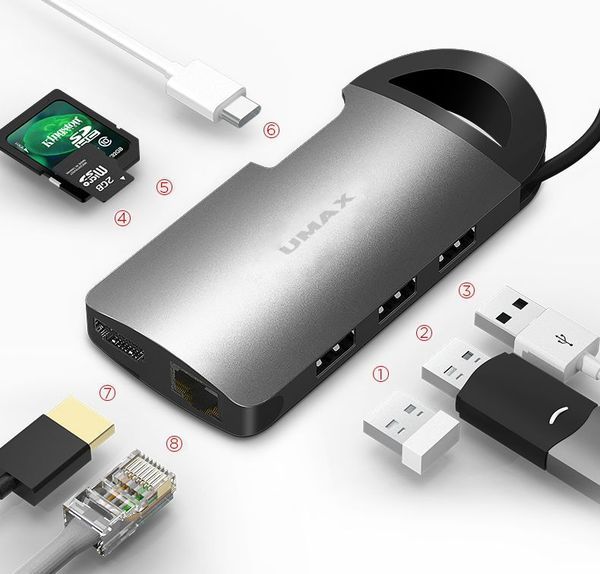 Wieloportowa przejściówka Umax U-Connect Multiport H8 doskonale uzupełnia Twojego MacBooka, Chromebooka lub Ultrabooka i rozszerza ich możliwości dzięki 8 portom, takim jak 4K HDMI, Gigabit Ethernet, 3 x USB 3.0, USB-C (dla ładowanie), czytnik kart Micro SD i SD. Umax U-Connect Multiport H8 zapewnia więcej portów i większą wygodę w celu zwiększenia produktywności.