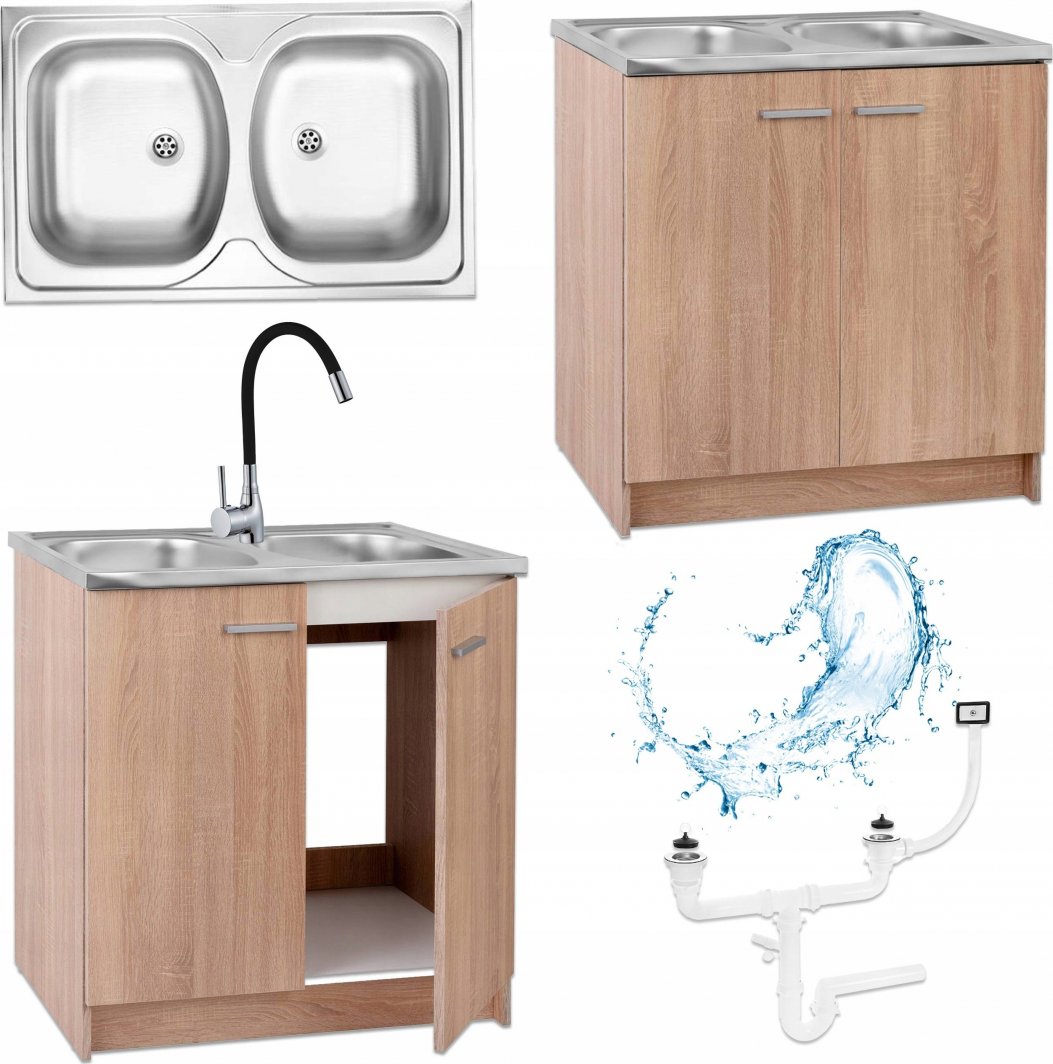Stamar Szafka Kuchenna Dąb Sonoma 80 Zlew 2 Komory Bateria Czarna Elastyczna Syfon