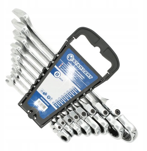 Zestaw kluczy płasko-oczkowych z grzechotką i przegubem łamanym STANDART NFGW0801ST to profesjonalne narzędzie, które doskonale sprawdzi się zarówno w warsztatach samochodowych, jak i w domowych garażach. Dzięki nowoczesnym rozwiązaniom, praca w trudno dostępnych miejscach staje się znacznie prostsza, umożliwiając wygodne dokręcanie i odkręcanie bez konieczności ciągłego zmieniania klucza.