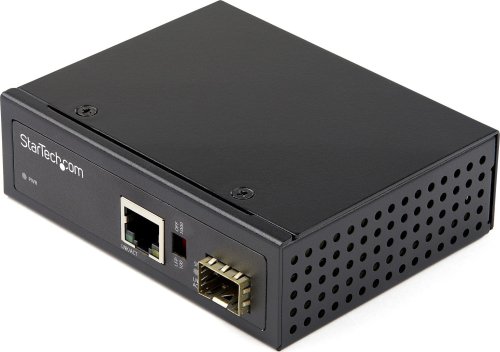 StarTech.com IMC1GSFP. Maksymalna szybkość przesyłania danych: 1000 Mbit/s, Standardy komunikacyjne: IEEE 802.3, IEEE 802.3x, Transmisja dwukierunkowa duplex: Pełny. Struktura światłowódu jednomodowego: Multifunkcyjny, Pojedynczy, MTBF (Średni okres międzyawaryjny): 569265 h. Kolor produktu: Czarny, Materiał obudowy: Aluminium, Stopień ochrony IP: IP30. Złącze światłowodowe: SFP, Technologia łączności: Przewodowa. Napięcie: 12 - 56 V, Typ wtyczki zasilającej: Typu N