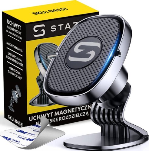 Uchwyt magnetyczny STAZER to nowatorskie rozwiązanie, które zapewnia wygodę oraz bezpieczeństwo podczas jazdy. Dzięki potężnemu magnesowi i taśmie klejącej 3M, uchwyt pewnie trzyma się w kokpicie, co zwiększa komfort korzystania z urządzeń mobilnych, nie zajmując miejsca na szybie.