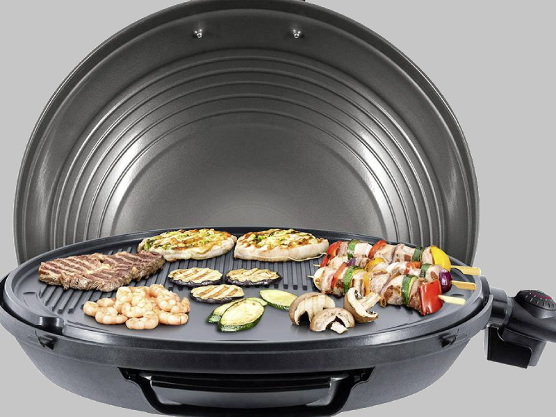- Nasadka na grilla: płyta grillowa z powłoką zapobiegającą przywieraniu (zdejmowany), pokrywa na grilla