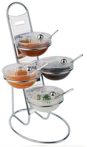 Stabilny stojak z metalu chromowanego zapewnia trwałość i elegancki wygląd, a dołączone pierścienie (1 podwójny i 2 pojedyncze) umożliwiają elastyczne rozmieszczenie misek na różnych poziomach. Całość można łatwo złożyć i dopasować do indywidualnych potrzeb.