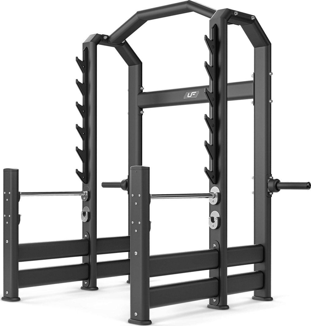 Model ten został wyposażony w sześć par uchwytów do odkładania sztangi oraz dodatkowy, regulowany pręt asekuracyjny umieszczony z przodu stojaków. Pozwala to wykonanie zarówno przysiadów ze sztangą, wspięć na palce w staniu, jak i martwego ciągu.
