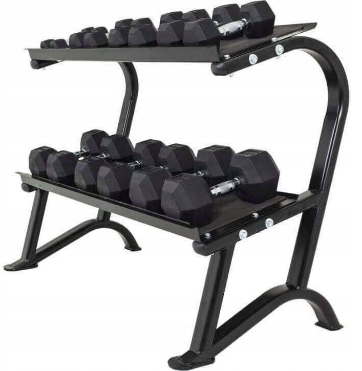 Dzięki dwupoziomowej budowie, stojak umożliwia bezpieczne uporządkowanie hantli, eliminując ryzyko ich uszkodzenia oraz zapewniając łatwy dostęp do każdego zestawu. To doskonałe rozwiązanie dla osób, które pragną maksymalnie wykorzystać przestrzeń w swoim miejscu treningowym.