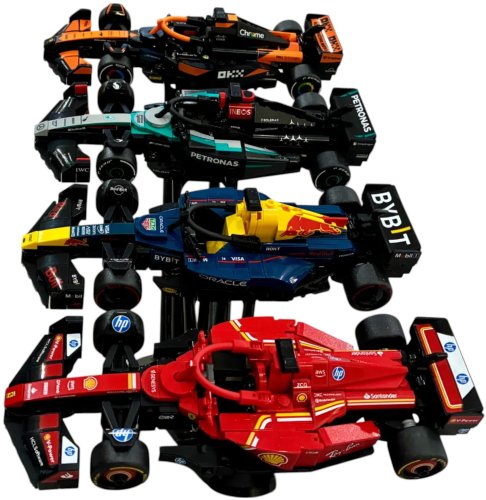 Ten unikalny stojak został stworzony z myślą o modelach Lego Speed Champions Formuły 1, w tym takich jak: