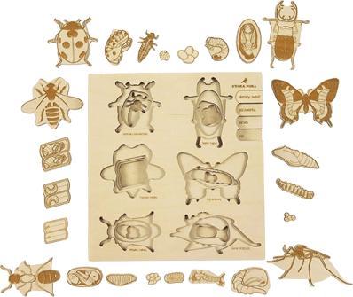 Zbadaj fantastyczny świat owadów, zobacz jakie przeobrażenia przechodzą w trakcie swojego życia, odkryj „obcych” żyjących pod naszym nosem. Przybliż swojemu dziecku świat entomologii. 6 owadów pokazanych w 4 fazach rozwoju (aż 24 puzzle do odkrycia!) nie tylko pomoże w zrozumieniu otaczającej nas przyrody, ale również w rozwoju motoryki dłoni twojej pociechy! Rozwiązań jest tak wiele! Puzzle 4-poziomowe.Wymiary: 28 x 30cm. 24 elementów + ramka i okładka.Grubość podstawy: 3 mm. Grubość okładki: 3 mm. Grubość puzzli : 5 mm. Pomalowane bezbarwnym, bezzapachowym lakierem z atestem dla dzieci.Wiek: 3+