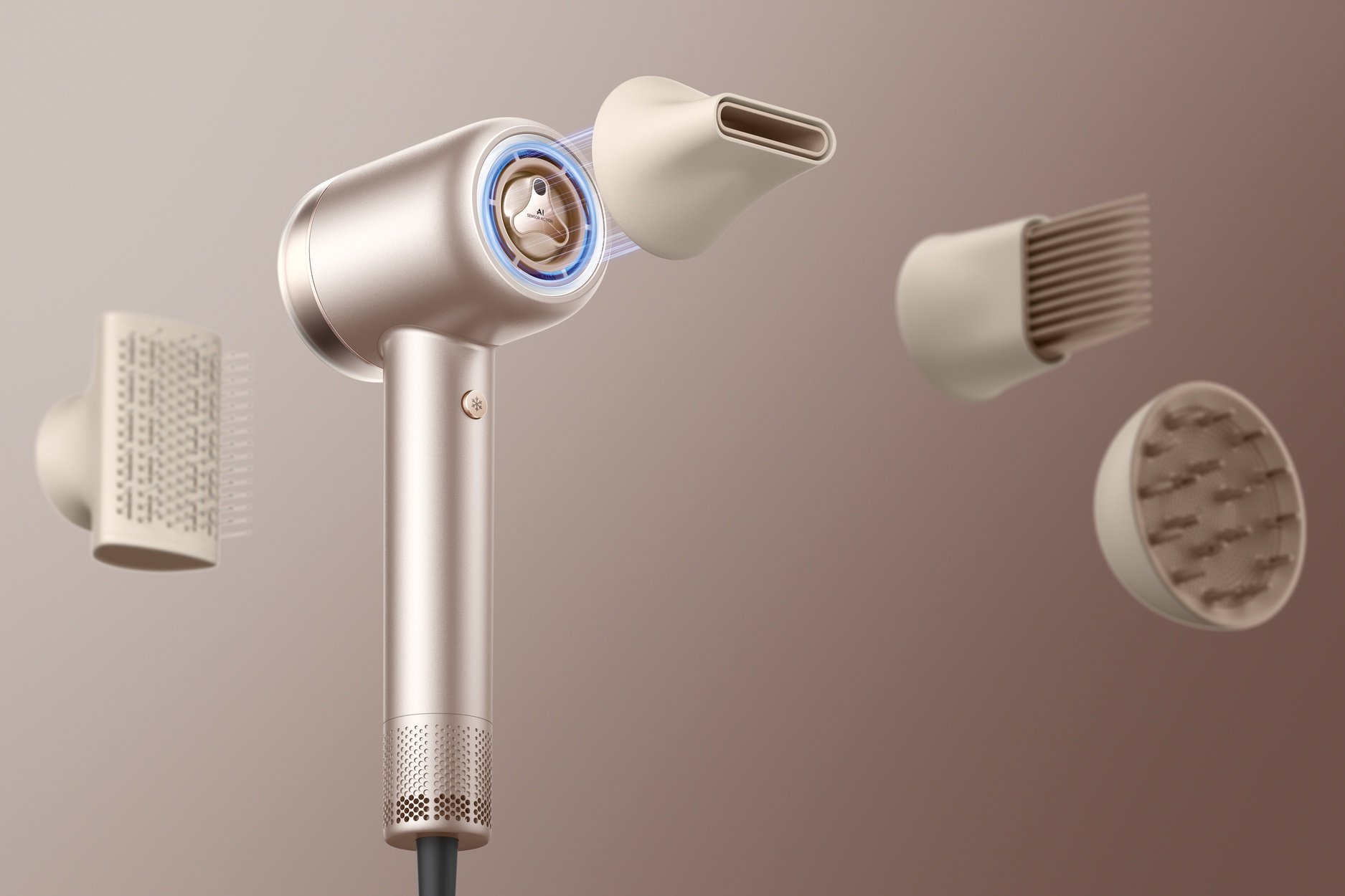 Wbudowany czujnik Halla automatycznie rozpoznaje rodzaj użytej końcówki. Po zamocowaniu nasadki, suszarka samoczynnie dobiera optymalną moc i temperaturę, aby zmaksymalizować skuteczność i ułatwić codzienną stylizację.