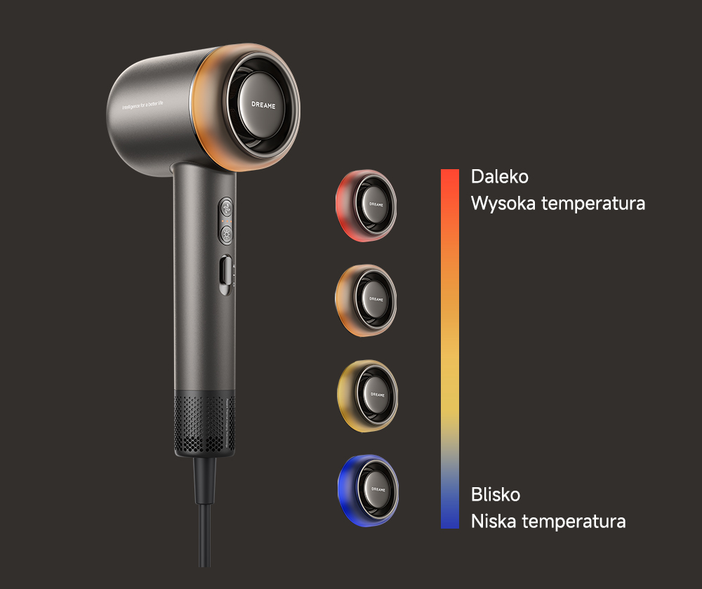 Umieszczony wokół dyszy pierścień LED zapewnia wizualną informację zwrotną o działaniu inteligentnej ochrony. Kolor pierścienia zmienia się automatycznie w zależności od odległości urządzenia od głowy, potwierdzając aktywne zarządzanie temperaturą: