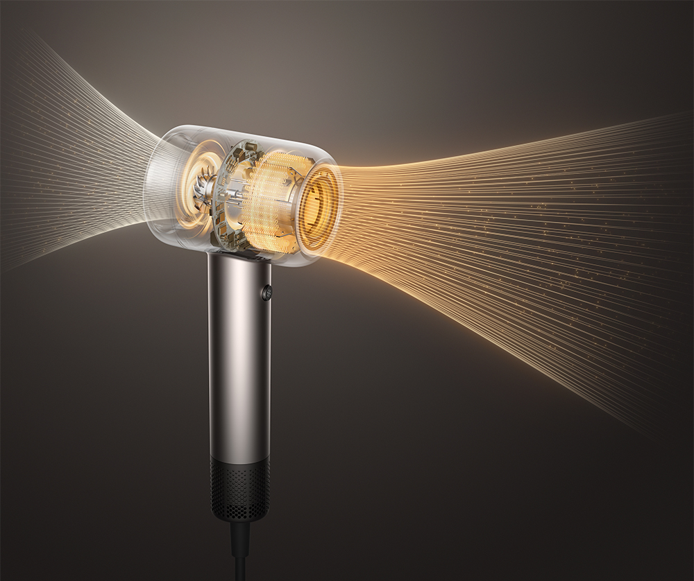 Sercem suszarki jest system o mocy 2000 W, wyposażony w powiększony, 32-milimetrowy silnik (wirnik), który osiąga prędkość 110 000 obr./min. Generuje to potężny strumień powietrza o przepływie do 60 m³/h i prędkości 60 m/s. Ta kombinacja sprawia, że suszenie jest nawet 1,5x szybsze i znacznie efektywniejsze.
