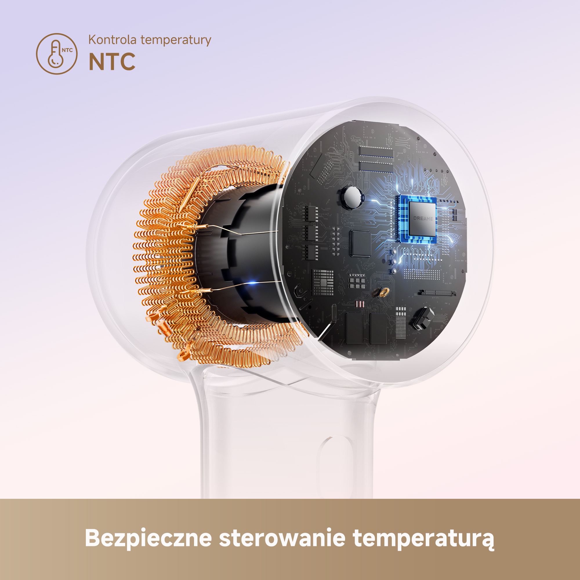 Długotrwała ekspozycja na gorące powietrze niszczy włosy. Dlatego Dreame Mini wyposażono w inteligentny system kontroli temperatury. Wbudowany termistor NTC mierzy temperaturę wydmuchiwanego powietrza aż 100 razy na sekundę, utrzymując ją na stałym, bezpiecznym poziomie 57°C. Technologia ta chroni włosy przed uszkodzeniem i przesuszeniem, zachowując ich naturalną miękkość i blask.