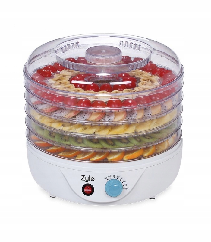 Dehydrator Zyle ma w zestawie aż 5 tac suszących. Pozwala to na suszenie wręcz przemysłowych ilości. Ścianki suszarki są przezroczyste, umożliwając monitorowanie procesu suszenia bez konieczności otwierania całego urządzenia. Wszystkie elementy dehydratora są wolne od bisfenoli-A (BPA-free), dlatego nie musisz obawiać się przenikania toksycznych związków do żywności.
