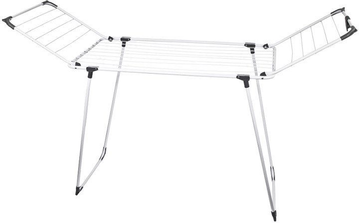 Produkt ten został zaprojektowany z myślą o wygodzie użytkowania. Jego dwa składane skrzydła pozwalają na uzyskanie nawet do 20 m powierzchni do suszenia prania. Dodatkowe otwory na wieszaki umożliwiają suszenie delikatnych ubrań, takich jak koszule czy marynarki, co pomaga dbać o ubrania i znacznie upraszcza proces prasowania. Dzięki dodatkowym miejscom na wieszaki uzyskujesz jeszcze więcej przestrzeni na suszenie. Po złożeniu, suszarka jest wyjątkowo kompaktowa i może być przechowywana w wąskich przestrzeniach, zarówno poziomo jak i pionowo.