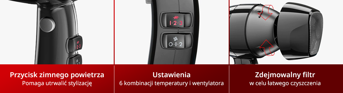 Valera Excel 1800 wyróżnia się zaawansowanymi funkcjami, które umożliwiają dostosowanie stylizacji do indywidualnych potrzeb użytkownika. Sześć ustawień przepływu powietrza i temperatury oraz przycisk COOL powietrza pozwalają na precyzyjne kontrolowanie procesu suszenia i stylizacji, zapewniając zarówno skuteczność, jak i ochronę włosów. Wyjmowany filtr oraz dołączona dysza koncentrująca dodatkowo ułatwiają obsługę i konserwację, czyniąc z Excel 1800 idealne narzędzie dla każdego, kto ceni sobie funkcjonalność i jakość.