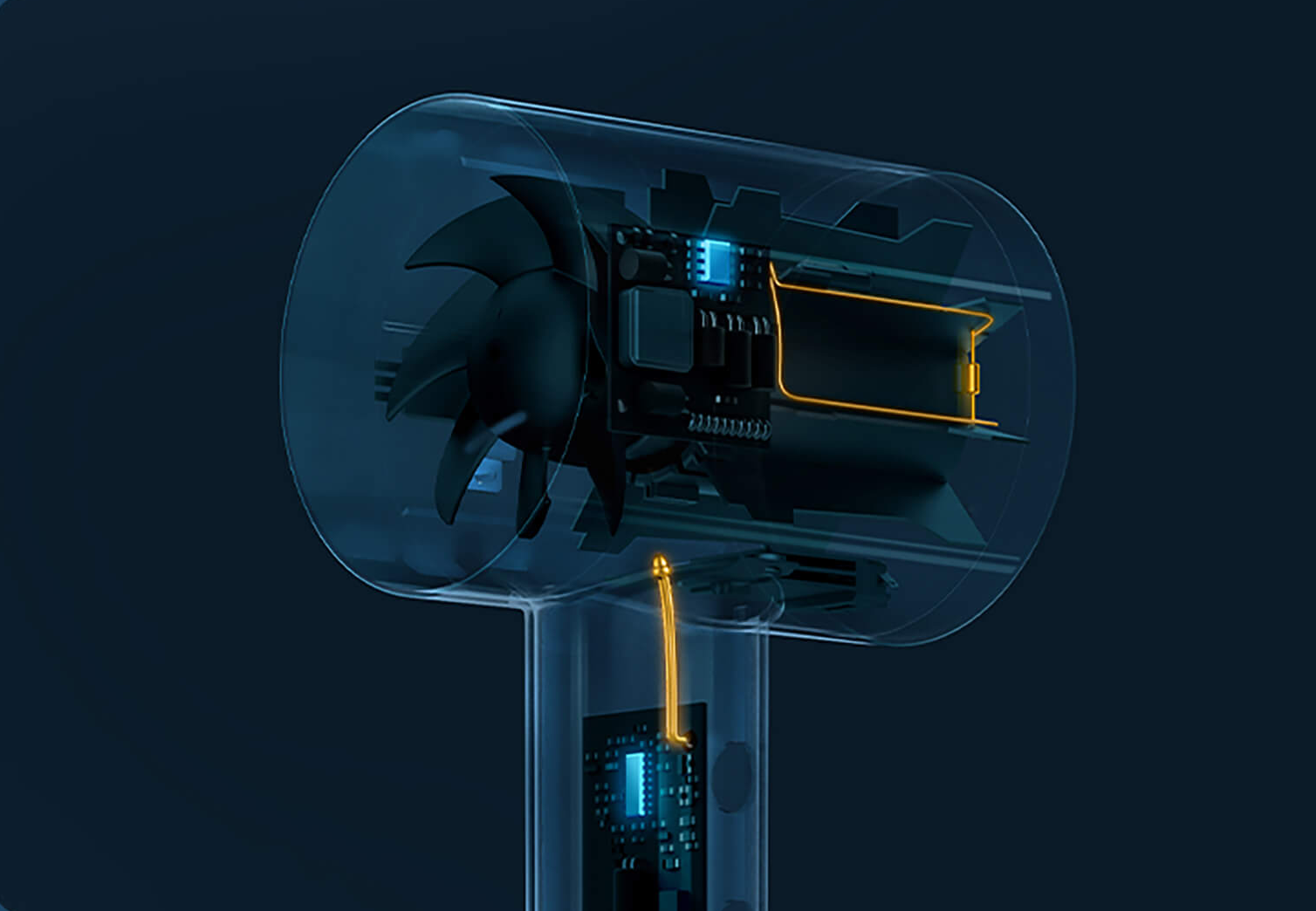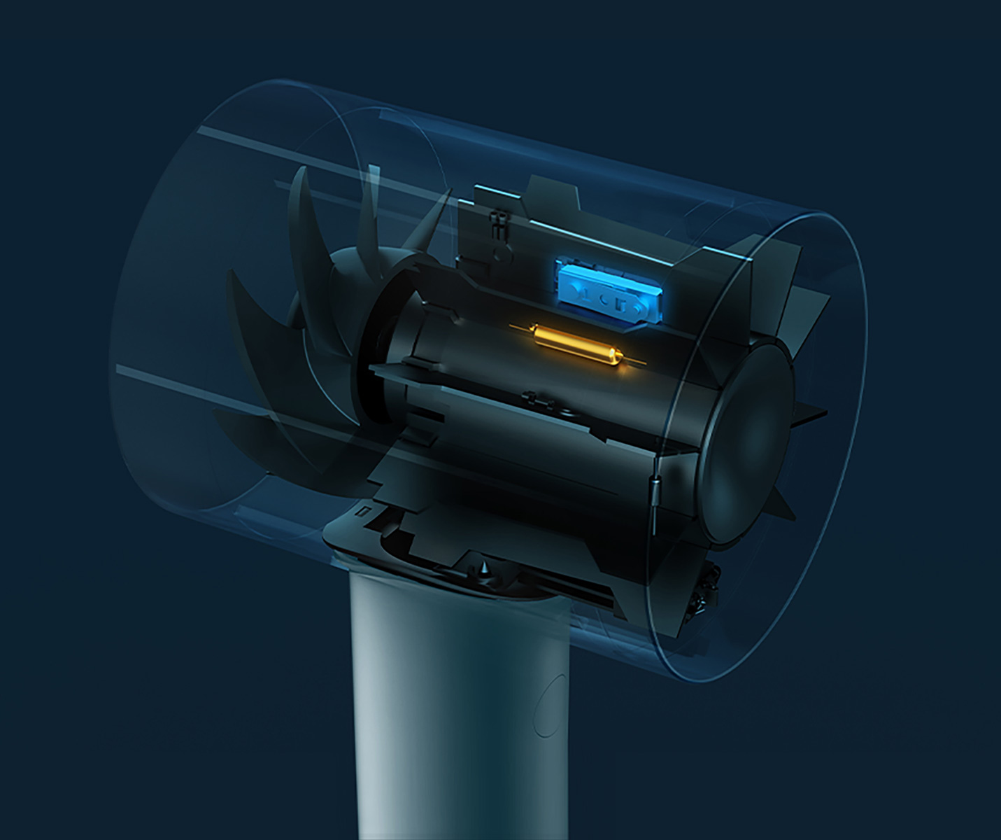 W oparciu o zasadę działania silników samolotowych, suszarka do włosów z jonami wody Xiaomi H500 jest wyposażona w silnik prądu stałego o wysokiej prędkości 20 000 obr./min i siedem łopatek w kształcie skrzydełka, które wytwarzają przepływ powietrza poprzez wyciskanie powietrza ze stożkowego kanału powietrznego pod ciśnieniem. Najwyższa prędkość przepływu powietrza to 20 m/s, co umożliwia dotarcie powietrza do cebulek i szybkie suszenie włosów bez ich uszkadzania.