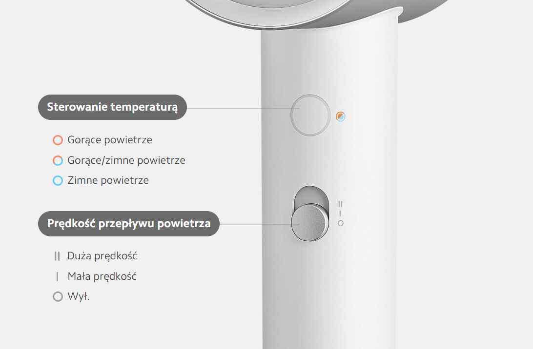 Trzy ustawienia temperatury umożliwiają przełączanie pomiędzy gorącym i zimnym powietrzem, a dwa poziomy prędkości pozwalają lepiej kontrolować modelowanie włosów. Kiedy temperatura powietrza jest zmieniana na gorącą lub zimną, dwukolorowy wskaźniki LED zmienia odpowiednio kolor światła. Ustawienia temperatury są automatycznie zapisywane do kolejnego użycia. Różne ustawienia prędkości i temperatury sprawiają, że suszenie i modelowanie włosów jest łatwiejsze i bardziej elastyczne.