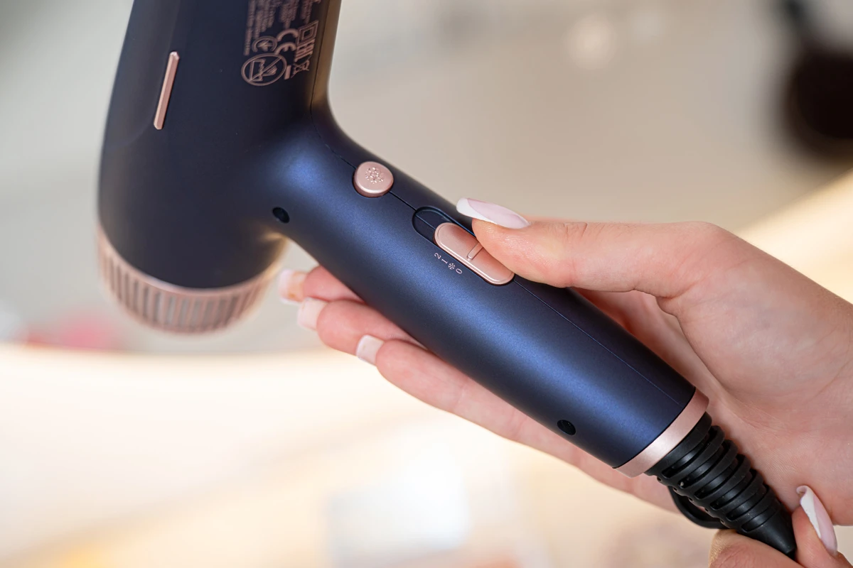 Suszarka oferuje 3 poziomy temperatury oraz 2 prędkości nawiewu, dzięki czemu możesz idealnie dopasować parametry do kondycji włosów – od delikatnego suszenia cienkich pasm po szybkie modelowanie gęstych fryzur. Intuicyjny panel sterowania sprawia, że nawet przy różnych typach włosów każdy suszący znajdzie swoje ulubione ustawienia.