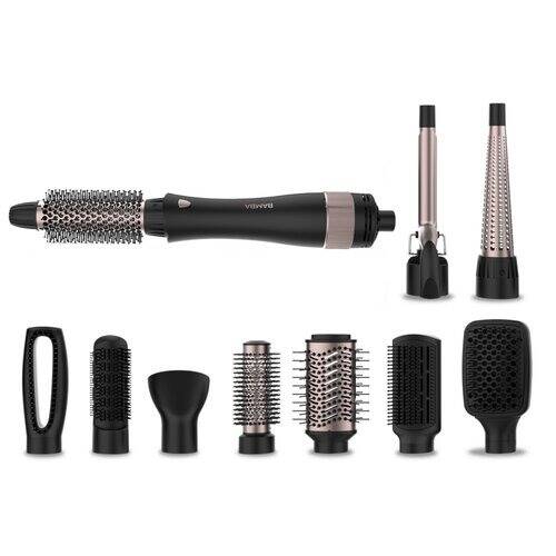 ✅ Rodzaj nasadek: 1 x koncentrator, 1 x mała szczotka wygładzająca, 1 x nakładka prostująca z klipsem, 1 x nasadka prostująca, 1 x okrągła szczotka, 1 x owalna szczotka, 1 x szczotka masująca, 1 x szczotka podkręcająca, 1 x szczotka prostująca z ruchomymi kolcami