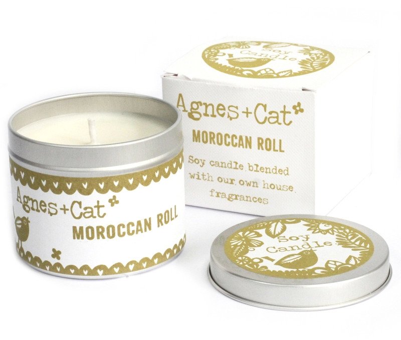 Świeca w puszce – Moroccan Roll. Wymiary 7,5 x 6 cm. Świeca zapachowa w metalowej puszce o pojemności 200 ml, pozwoli Ci wypełnić pomieszczenie świeżym, niepowtarzalnym zapachem. Wykonana z naturalnego wosku sojowego i pięknych aromatów stworzonych z mieszanki naturalnych olejków eterycznych i wysokiej jakości olejków perfumeryjnych. Świece z wosku sojowego są doskonałą, ekologiczną alternatywą dla świec parafinowych. Palą się równomiernie, dzięki czemu po bokach puszki nie zostaje żaden wosk. Dodatkowo świece sojowe ładnie rozpraszają zapach i są po prostu lepsze dla naszej planety. Trochę droższe, ale warto. Palą się o 30-50% dłużej i nie zawierają toksyn, które posiadają świece parafinowe. Czas palenia świecy wynosi aż 30 godzin.