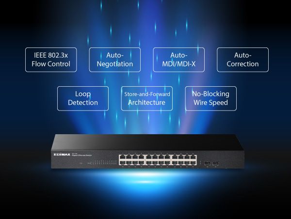 Wyposażony w kontrolę przepływu IEEE 802.3x. Automatyczna negocjacja, brak blokowania prędkości drutu, Auto-MDI/MDI-X, automatyczna korekcja, wykrywanie pętli, architektura Store-and-Forward, która filtruje pakiety z błędami fragmentów i CRC w celu maksymalizacji wydajności sieci.