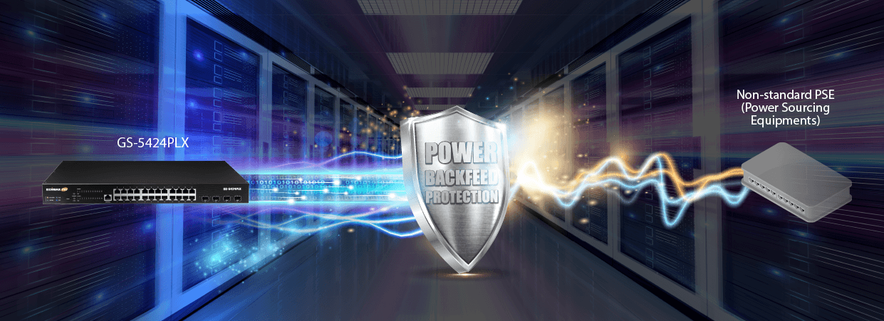 Każdy port wyposażony jest w zabezpieczenie przed prądem wstecznym, aby uniknąć uszkodzenia portów PoE, gdy podłączone są niestandardowe urządzenia PSE (Power Sourcing Equipment).
