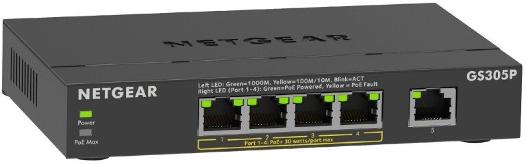 NETGEAR GS305P to przełącznik niezarządzalny, co oznacza, że jego konfiguracja jest niezwykle prosta i nie wymaga skomplikowanej obsługi. Dzięki pięciu portom, w tym czterem portom PoE+, możesz łatwo podłączyć i zasilać wiele urządzeń w swojej sieci.